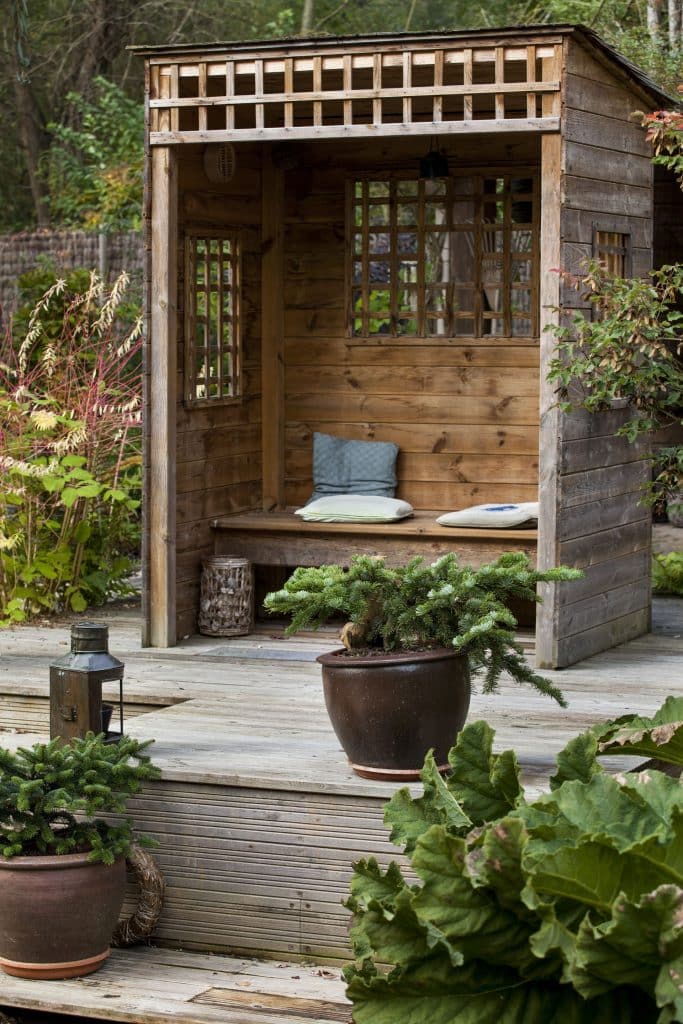 Menuiseries : comment choisir pour son abri ? Abri en bois avec banc sur terrasse. Pots de pinus sur la terrasse/Jardin de la Grenouillère, BG/Rustica